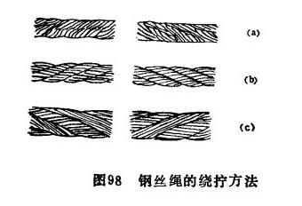 綜合以上兩種繞擰方式二繞成的鋼絲繩叫混合繞擰式。如圖98(c)所示。它具有單向繞擰式的一些優(yōu)點,并不會自行松散和扭轉(zhuǎn)。
