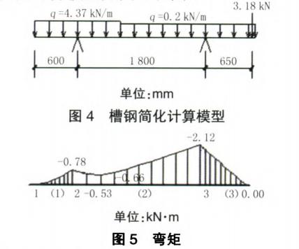 2)18a#槽鋼參數(shù)。截面抵抗141cm3;抗彎強度設(shè)計值205N/m㎡;線載荷0.2kN/m。