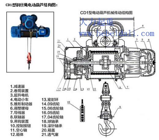 CD1型電動葫蘆具有結構緊湊、自重輕、體積小,操作方便等特點。既可以單獨安裝在架空工字梁上,也可以配套安裝在電動或手動單梁、雙梁、懸掛、龍門等起重機上。