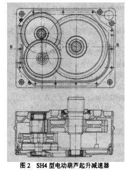 在起重機(jī)械中生產(chǎn)量最大,使用最廣泛的電動(dòng)葫蘆,它選擇不到標(biāo)準(zhǔn)減速器,它必須由設(shè)計(jì)者感覺電動(dòng)葫蘆起升機(jī)構(gòu)總體的設(shè)計(jì)要求設(shè)計(jì)電動(dòng)葫蘆專用的起升減速器,當(dāng)然也包括設(shè)計(jì)電動(dòng)小車的減速器。按圖1的總體部件的布置,起升減速器一端與電動(dòng)機(jī)鏈接,另一端與卷筒裝置鏈接。電動(dòng)機(jī)的輸出軸頭是小齒輪,它與減速器第一級(jí)大齒輪嚙合:減速器的最后一級(jí)輸出軸是花鍵,它直接雨卷筒鏈接。SH4型減速器見圖2.