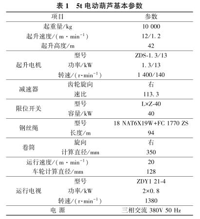 移動式電動葫蘆吊物系統(tǒng)主要由5,10t 電動葫蘆、電動葫蘆運行軌道及電氣控制系統(tǒng)組成。 在結(jié)構(gòu)邊跨設(shè)吊物孔,吊物孔處1,2 層及地下室各層梁板結(jié)構(gòu)留空,在3層主體結(jié)構(gòu)梁下(高度≥8m),利用3層結(jié)構(gòu)梁板作為支承,支承梁板及洞口邊梁進(jìn)行結(jié)構(gòu)加強。移動式電動葫蘆吊物系統(tǒng)利用3層結(jié)構(gòu)梁預(yù)埋對穿螺栓、主體結(jié)構(gòu)施工時的支模架改作操作平臺及塔式起重機、手動葫蘆等工具配合完成安裝,經(jīng)荷載試驗及驗收合格后方可使用。5,10t電動葫蘆基本性能參數(shù)分別如表1,2 所示。