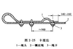 卡接法是把鋼絲繩的一端(或兩端)彎成一個(gè)環(huán)圈,用鋼絲繩卡把繩端緊固,如圖2-25所示。鋼絲繩卡主要用于槍桿起重機(jī)纜風(fēng)繩頭的固定、穿繞滑車組時(shí)鋼絲繩端頭的固定(即死頭)、鋼絲繩的臨時(shí)連接及捆綁繩的固定等。